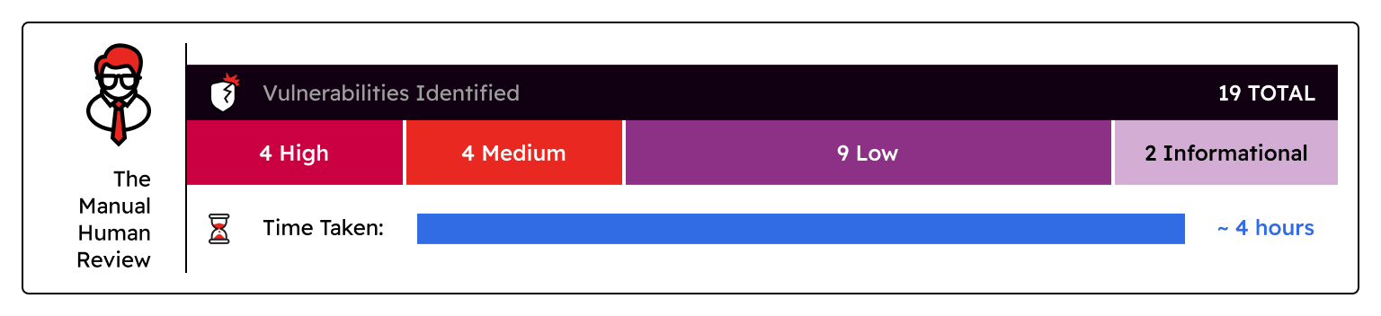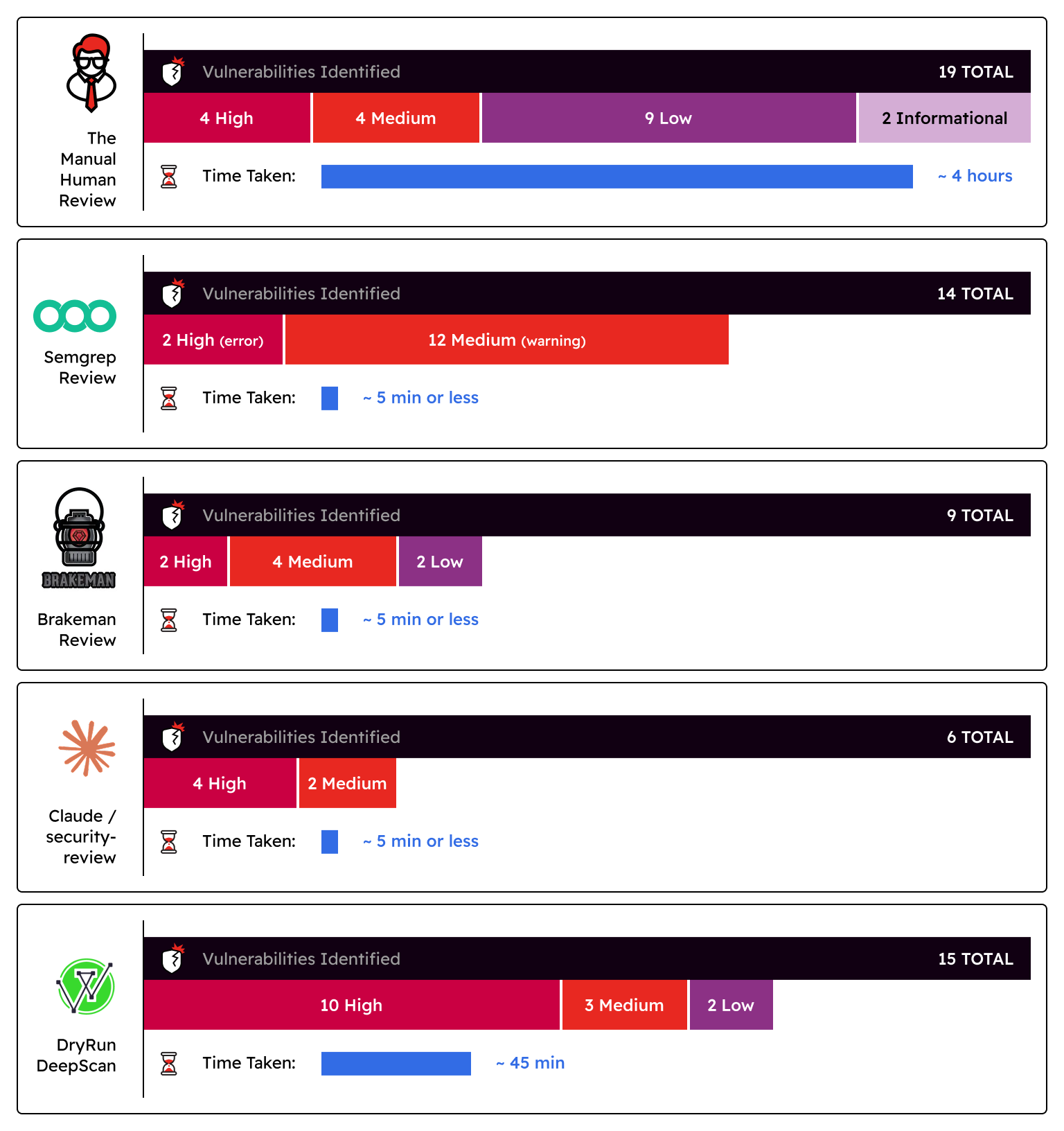 - Verdict: This 4-hour block included running many SAST tools and analyzing the false positives. While the human review was able to granularly catch things like a static charge amount set on all carts and a high-risk Deserialization of Untrusted Data vulnerability that no other tool was able to identify, they did miss a Server-Side Request Forgery (SSRF) vulnerability that AI scanners caught.