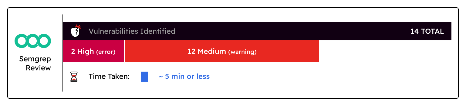 - Verdict: Semgrep flagged portions of the code that could lead to SQL injection, XSS, and IDOR, but the results still required some human review to validate the logic behind them. It also did not flag any of the best practices like password complexity, missing account lock thresholds, and a lack of MFA that the human review also flagged.