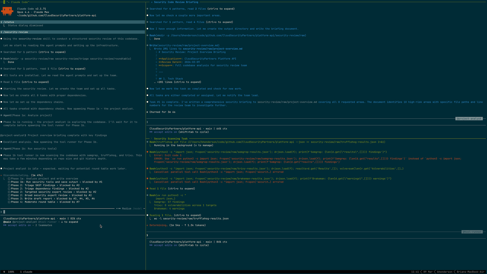 We chose the third option: a phased model with parallel triage and parallel experts. The recon phase produces shared context, then four analysis agents run in parallel, followed by report writing and the round table. This maximizes parallelism during the most time-consuming work while respecting real sequential dependencies (you can't triage semgrep results before semgrep runs).