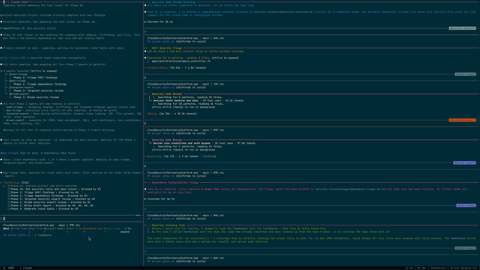 A single expert agent trying to deep-dive into JWT implementation and sweep every controller for mass assignment will do both poorly. Two agents with distinct mandates produce better coverage with less context pollution: one tracing data flow through code paths, another sweeping the full codebase for common vulnerability classes.